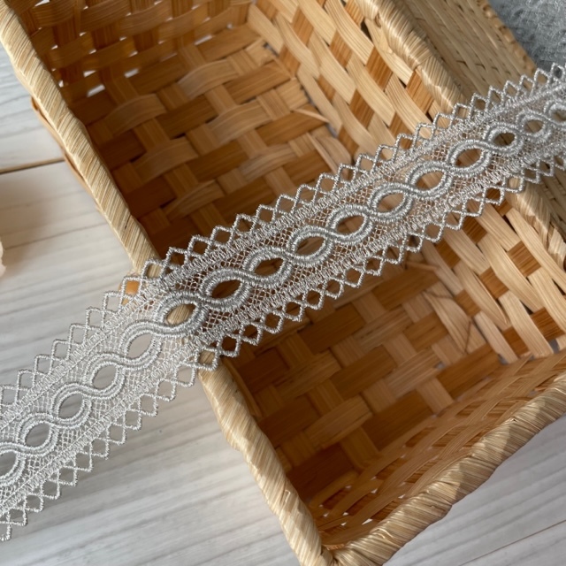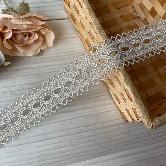 ケミカルレース 銀色 幅3.4cm 両山薄手の幾何学柄 3m巻 日本製 [72142 シルバー]
