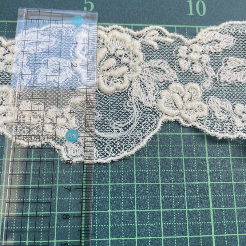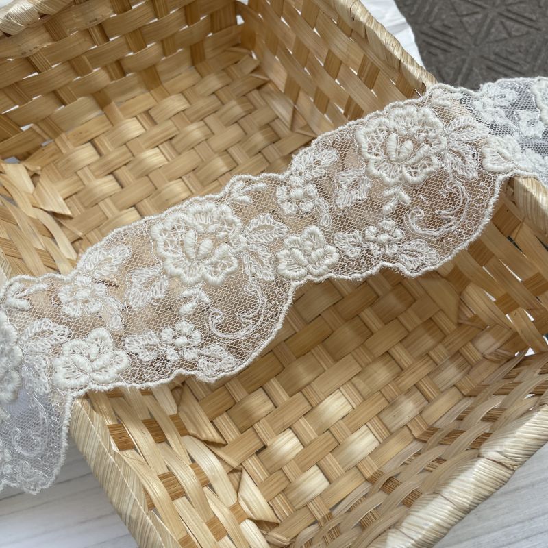 【高品質な日本製】チュールレース ウール糸 オフ白ラメ 幅5cm薔薇縁取りレース 1m [08935 生成り]