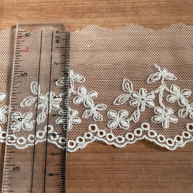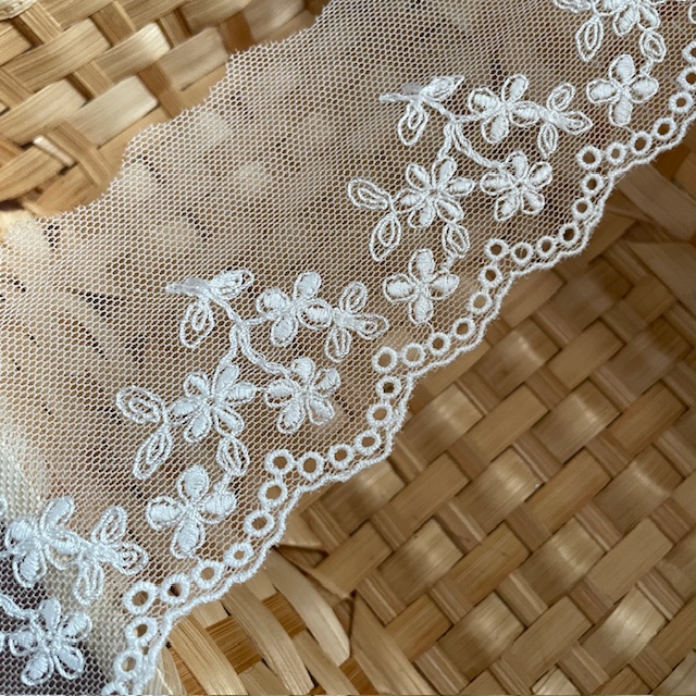 【高品質な日本製】チュールレース オフホワイト 幅1.2cm 3m巻 両山小花と葉っぱ柄 刺繍は綿糸100% [53535 オフ白(3m)]