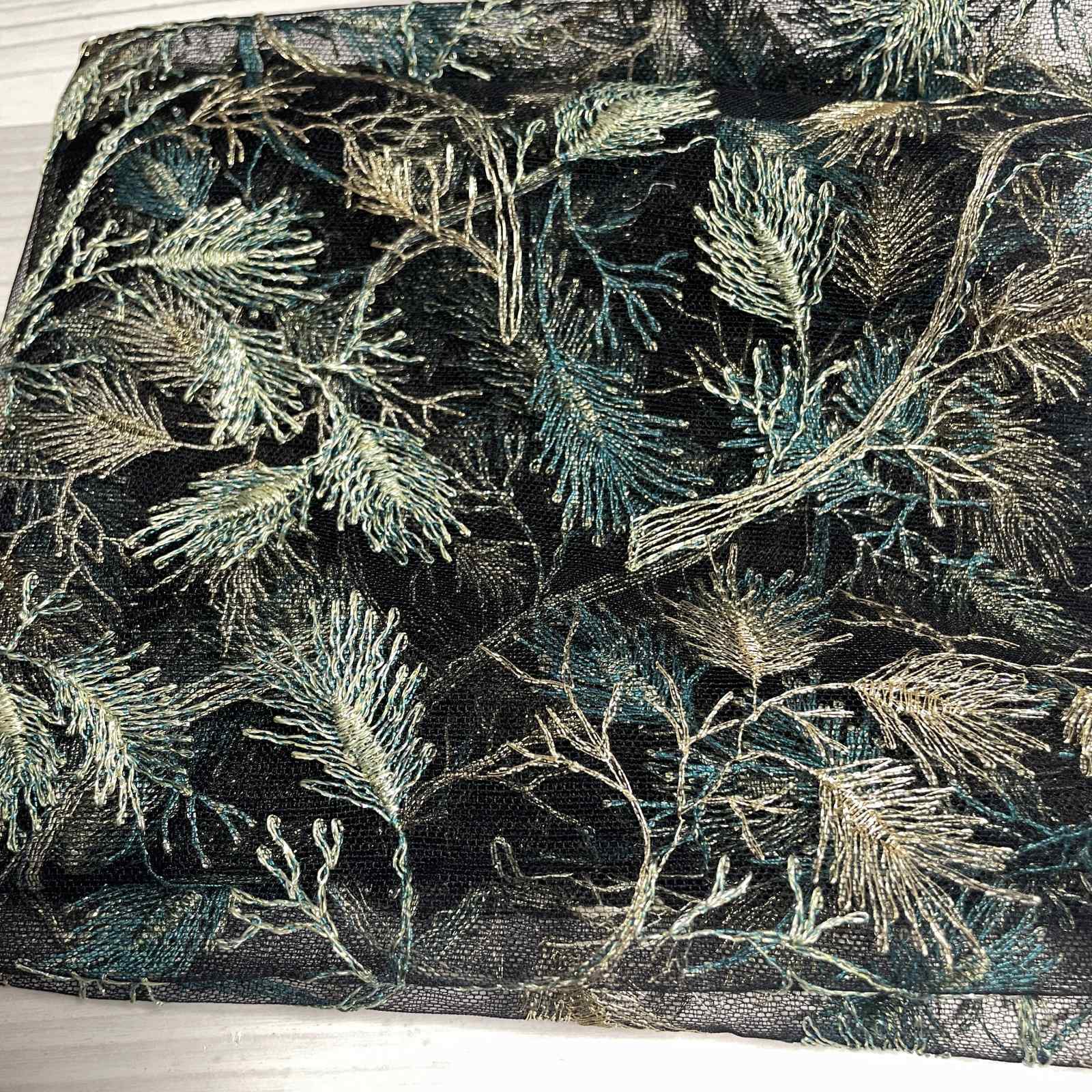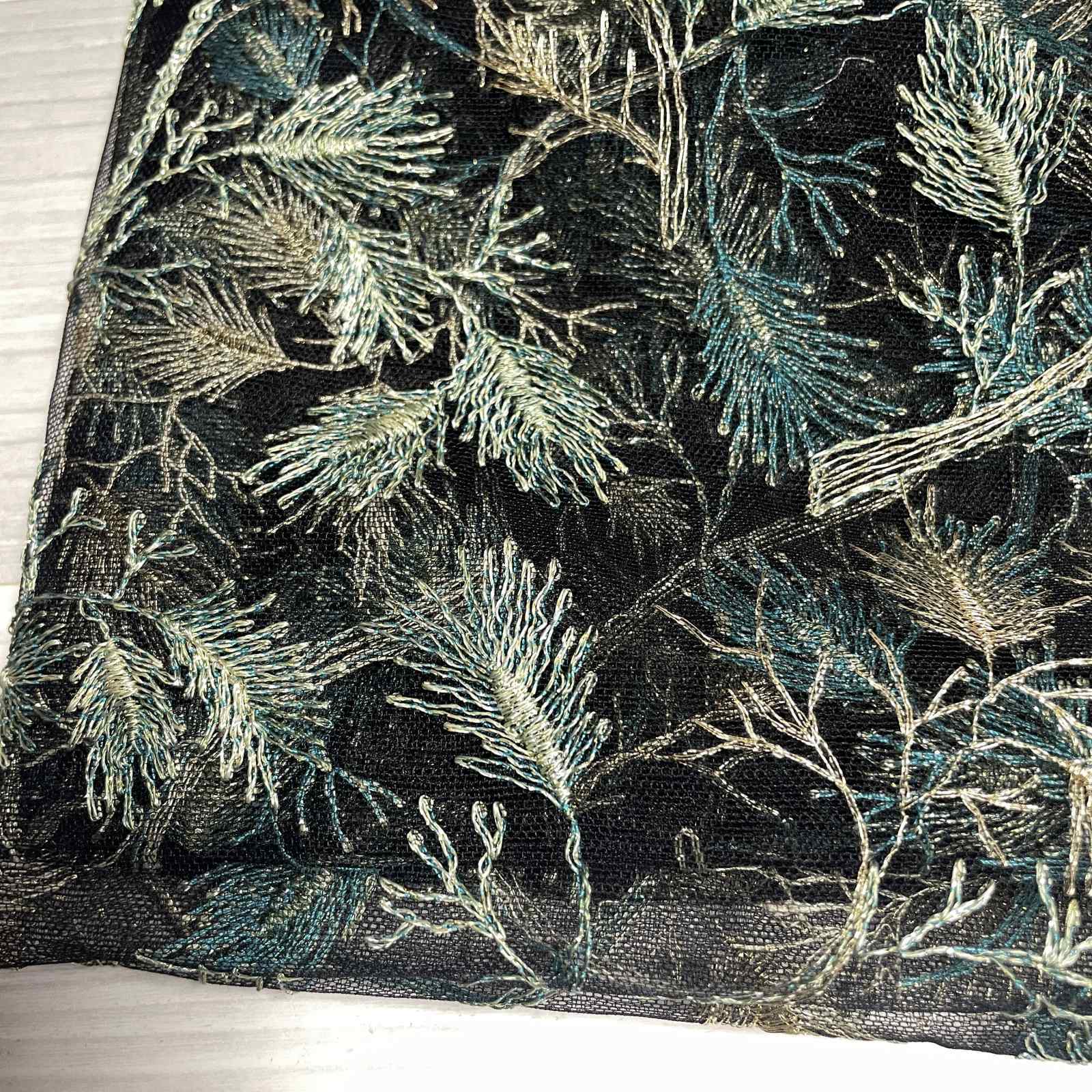 【日本製】刺繍レース生地 約20cm×約130cm クジャクの羽みたいな葉っぱ柄刺繍レース ブラックみどり [90185黒]